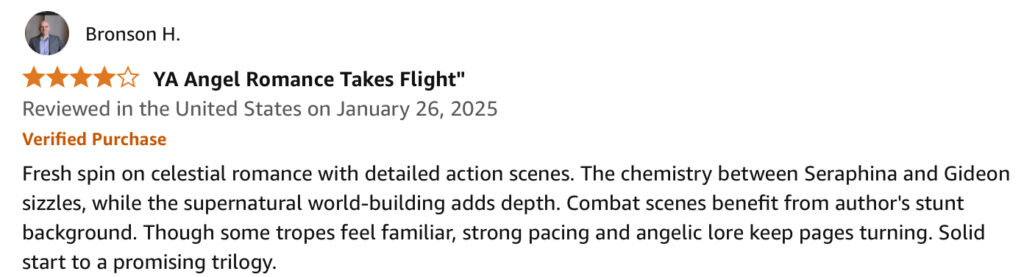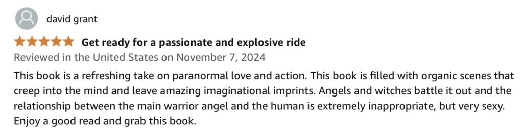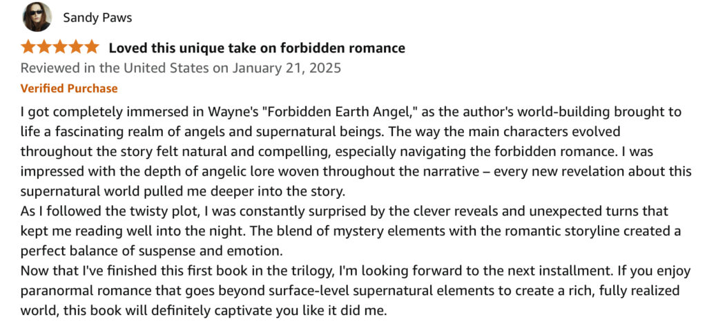 “Seraphina’s life transforms when she discovers her true identity as a half-angel, thrust into a realm of angels, fae, and immortal witches. As she navigates newfound powers and a forbidden romance with her Guardian, Gideon, the stakes escalate with dark forces closing in. Forbidden Earth Angel weaves a captivating tale of love, betrayal, and supernatural conflict, drawing readers into a fantastical universe where Seraphina’s destiny unfolds amidst secrets that threaten to unravel her world.”